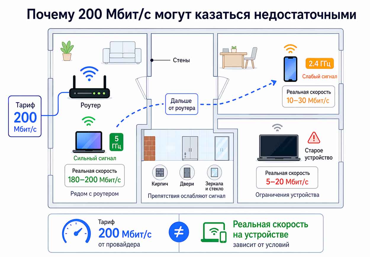 Это один из самых частых перекосов в восприятии. Пользователь видит тариф 200 Мбит/с, но на ноутбуке в дальней комнате получает заметно меньше и делает вывод, что скорость слишком маленькая. На деле ограничение часто находится не в тарифе, а внутри квартиры.